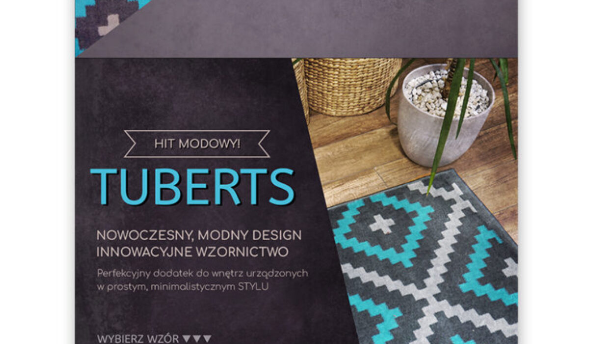 Projekt strony typu Landing Page stworzonych na platformę Allegro przedstawia asortyment tekstyliów domowych – dywan z linii TUBERTS. Poniżej przedstawione są projekty wewnętrznych stron Landing Page stworzonych na platformę e-handlu Allegro, projekt graficzny witryny internetowej, a także materiały marketingowe firmy Kontrast: