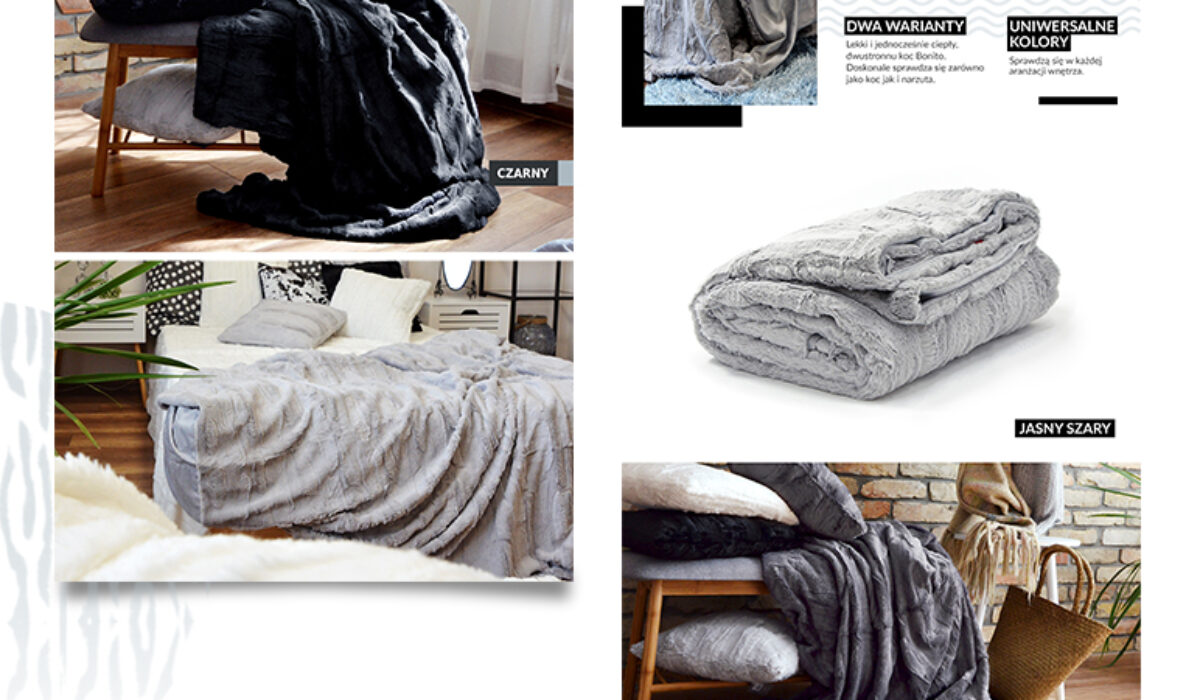 Seria projektów wewnętrznych stron typu Landing Page stworzonych na platformę Allegro przedstawia asortyment tekstyliów domowych – koc oraz poduszki – z serii BONITO. Poniżej przedstawione są projekty wewnętrznych stron Landing Page stworzonych na platformę e-handlu Allegro, projekt graficzny witryny internetowej, a także materiały marketingowe firmy Kontrast: