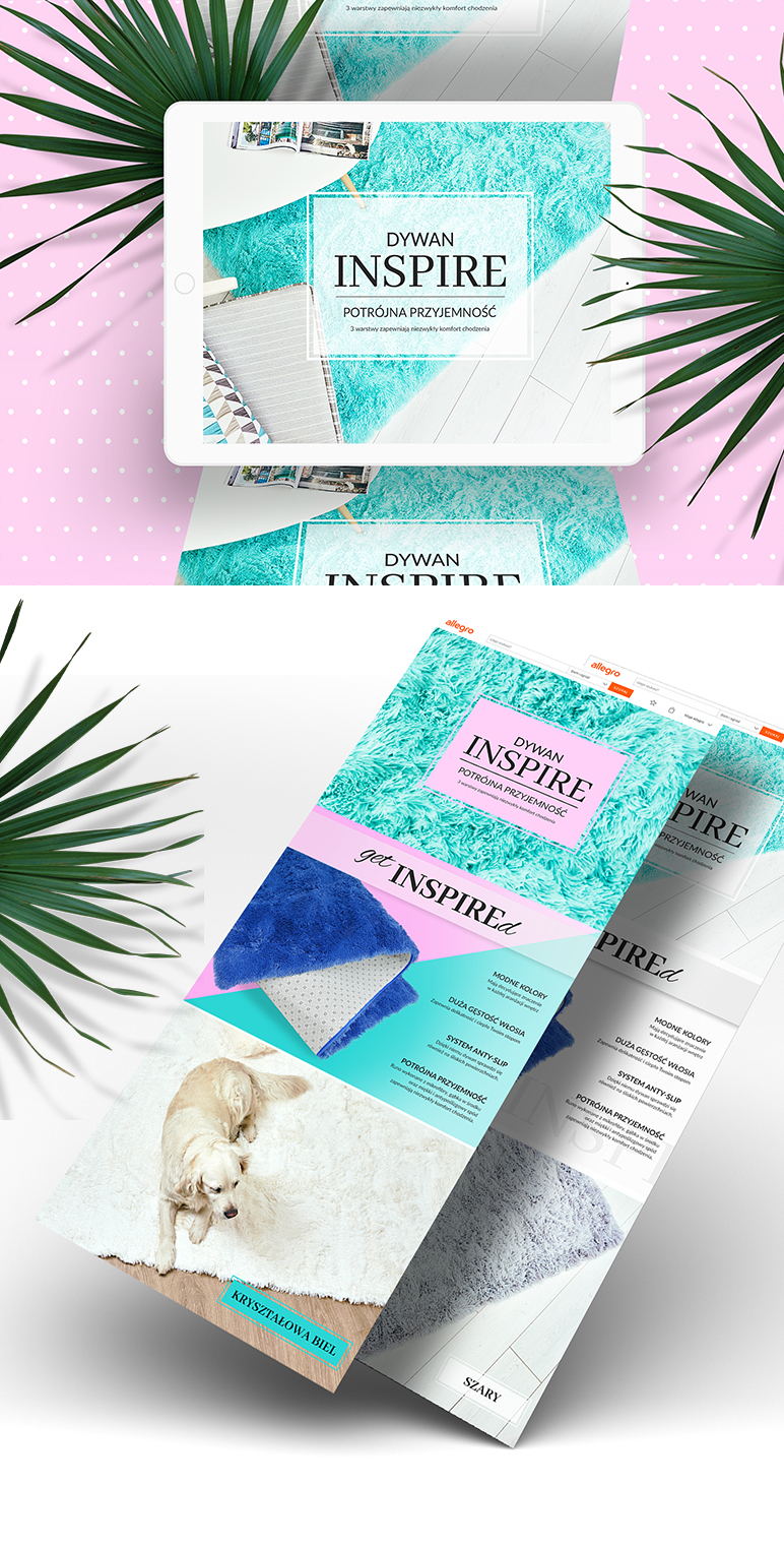 Seria projektów wewnętrznych stron typu Landing Page stworzonych na platformę Allegro przedstawia asortyment dywanów z linii INSPIRE.