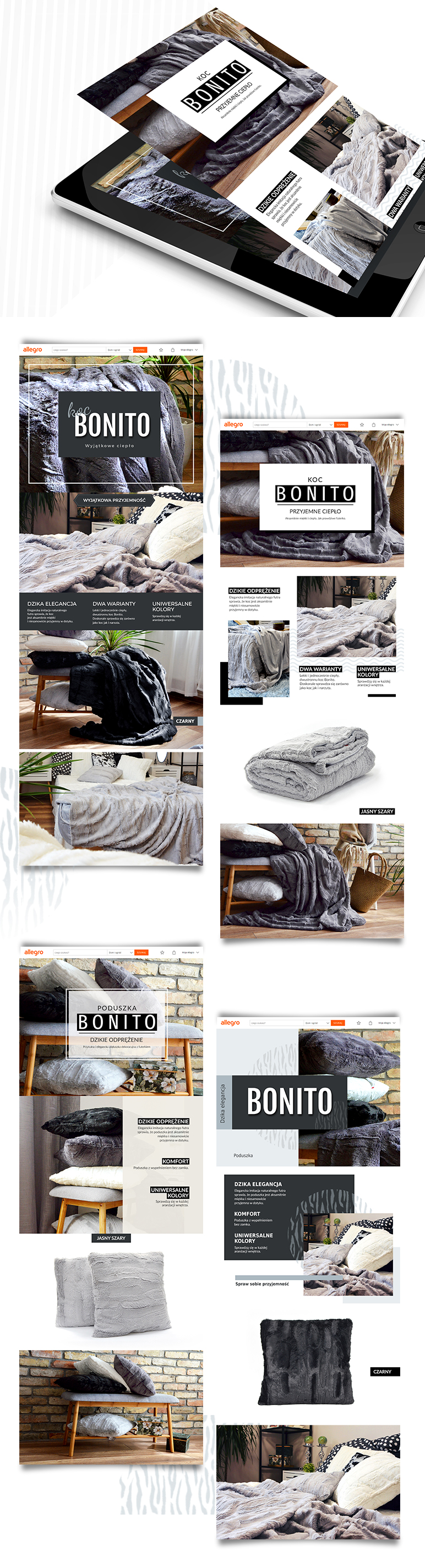 Seria projektów wewnętrznych stron typu Landing Page stworzonych na platformę Allegro przedstawia asortyment tekstyliów domowych – koc oraz poduszki – z serii BONITO.