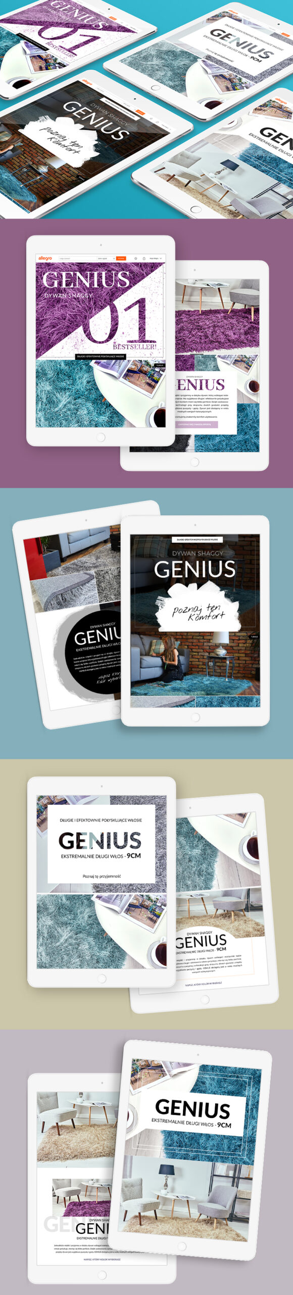 Seria projektów wewnętrznych stron typu Landing Page stworzonych na platformę Allegro przedstawia asortyment dywanów z serii GENIUS.