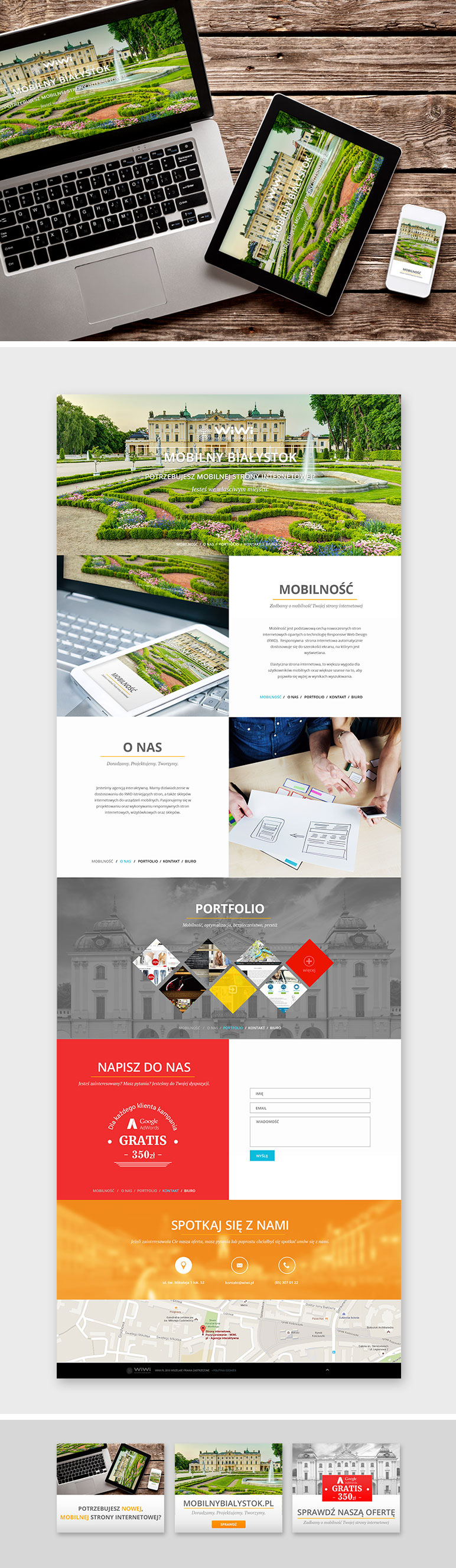 Responsywna strona internetowa typu Landing Page „Mobilny Białystok”, zaprojektowana na potrzeby wewnętrzne firmy WiWi. Do projektu Landing Page została opracowana seria animowanych banerów reklamowych, wykorzystanych w sieci reklamowej Google AdWords.