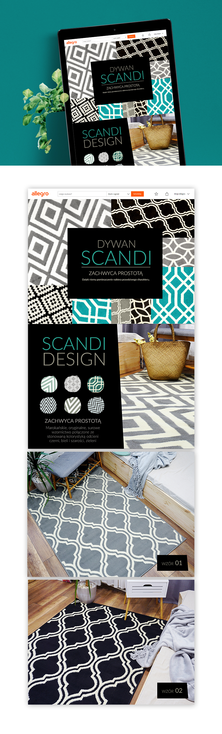 Projekt strony typu Landing Page stworzonych na platformę Allegro przedstawia asortyment tekstyliów domowych – dywan z linii SCANDI.