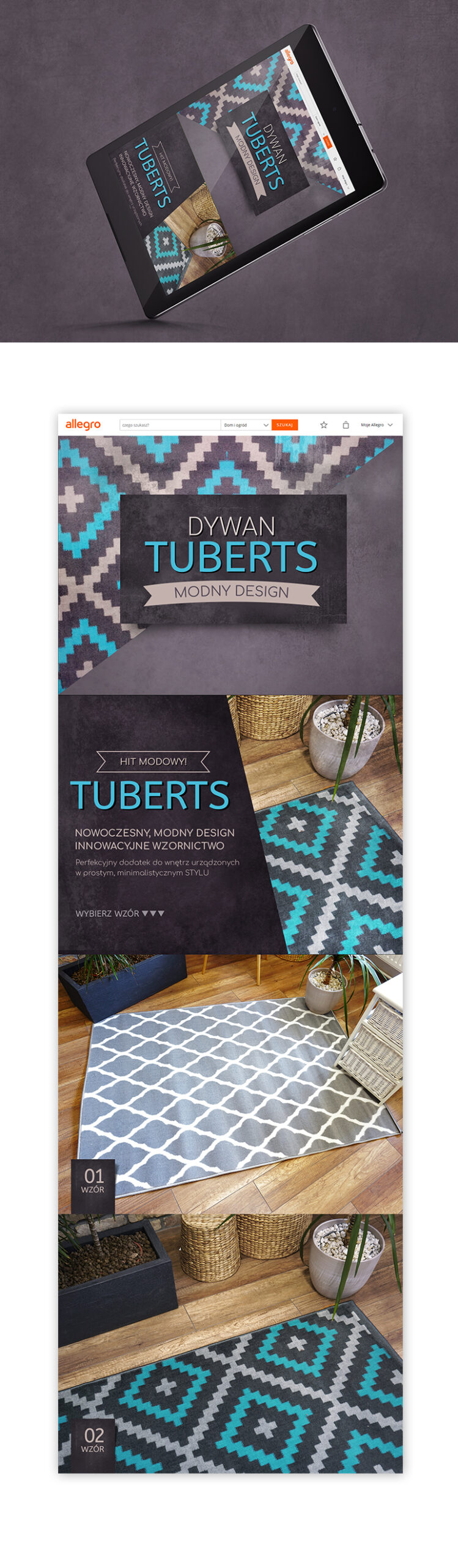 Projekt strony typu Landing Page stworzonych na platformę Allegro przedstawia asortyment tekstyliów domowych – dywan z linii TUBERTS.